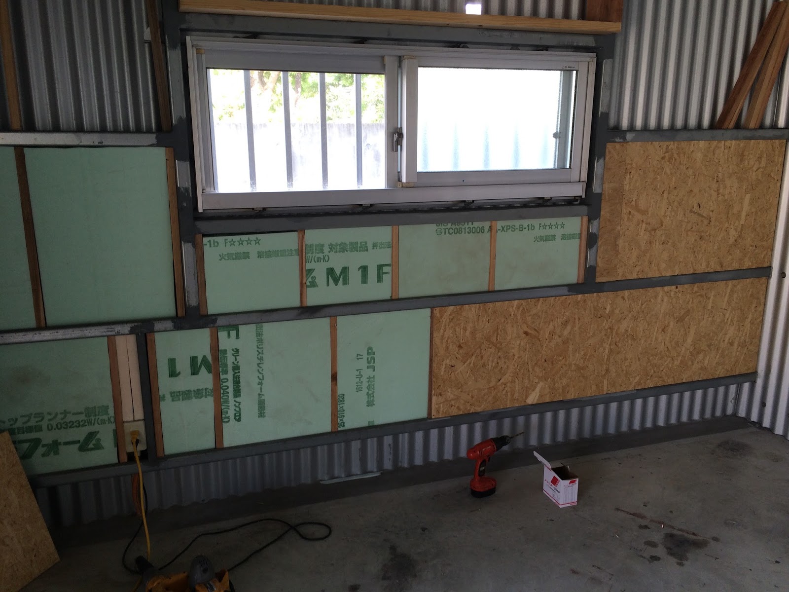 鉄骨の間に枠と断熱材をはめ込んで板で壁を作っていきます!